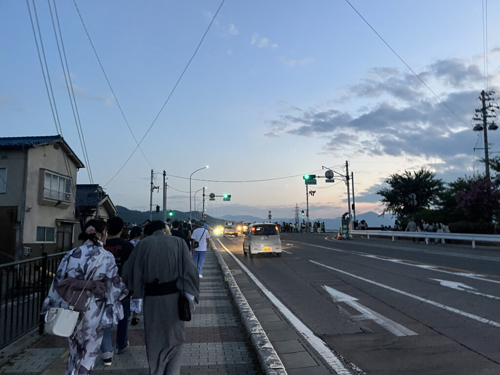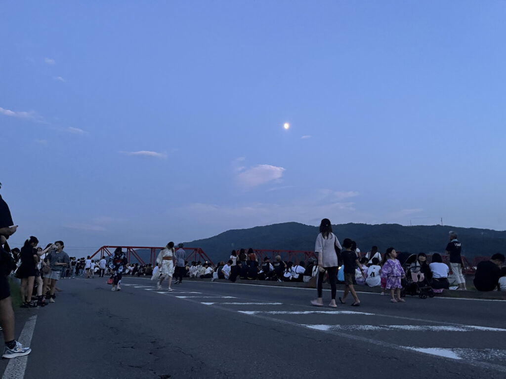 南側へ歩いても、やっぱり人いない。あまりの人のいなさに不安になりながら二の丸通りに出ると浴衣姿の人たちがちらほら。「よかった、ちゃんと今日だ」と安心。ともあれ時刻は18時40分。ここで見物するか、もしくはもう少し打上げ場所(千曲川河川敷)へ行くか迷っていると、向こうから折りたたみ椅子を抱えた老夫婦が歩いてくる。開始20分前にこの余裕。さぞかし名スポットを知っているに違いないと声をかけてみると、これから河川敷に行くという。「え、今からでも場所空いてるんですか?」と尋ねると「全然いけるよ」とのこと。